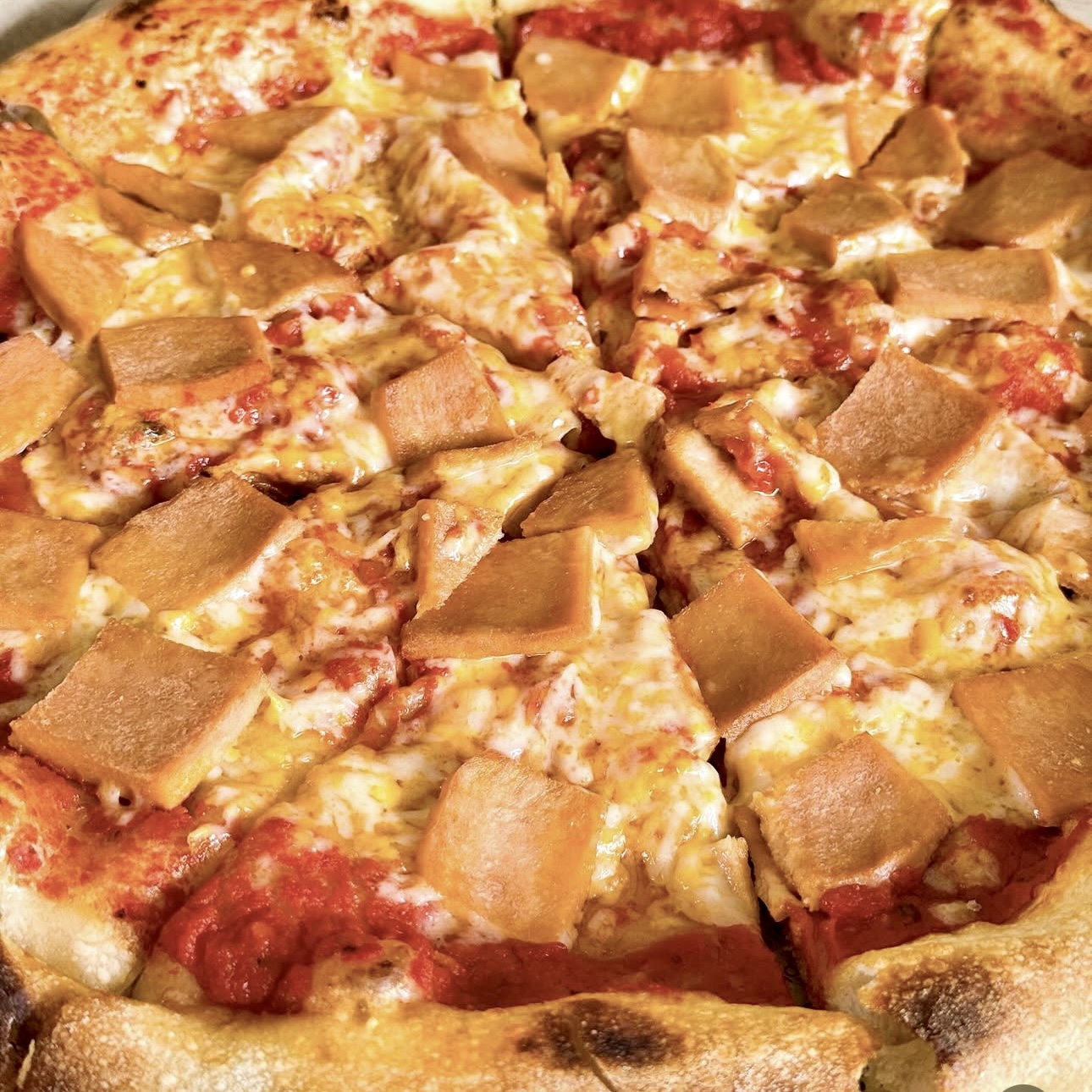 Ingredients: Homemade Pizza Dough. Homemade Pizza Sauce. Vegan Mozzarella. Vegan Cheddar. Vegan Ham.